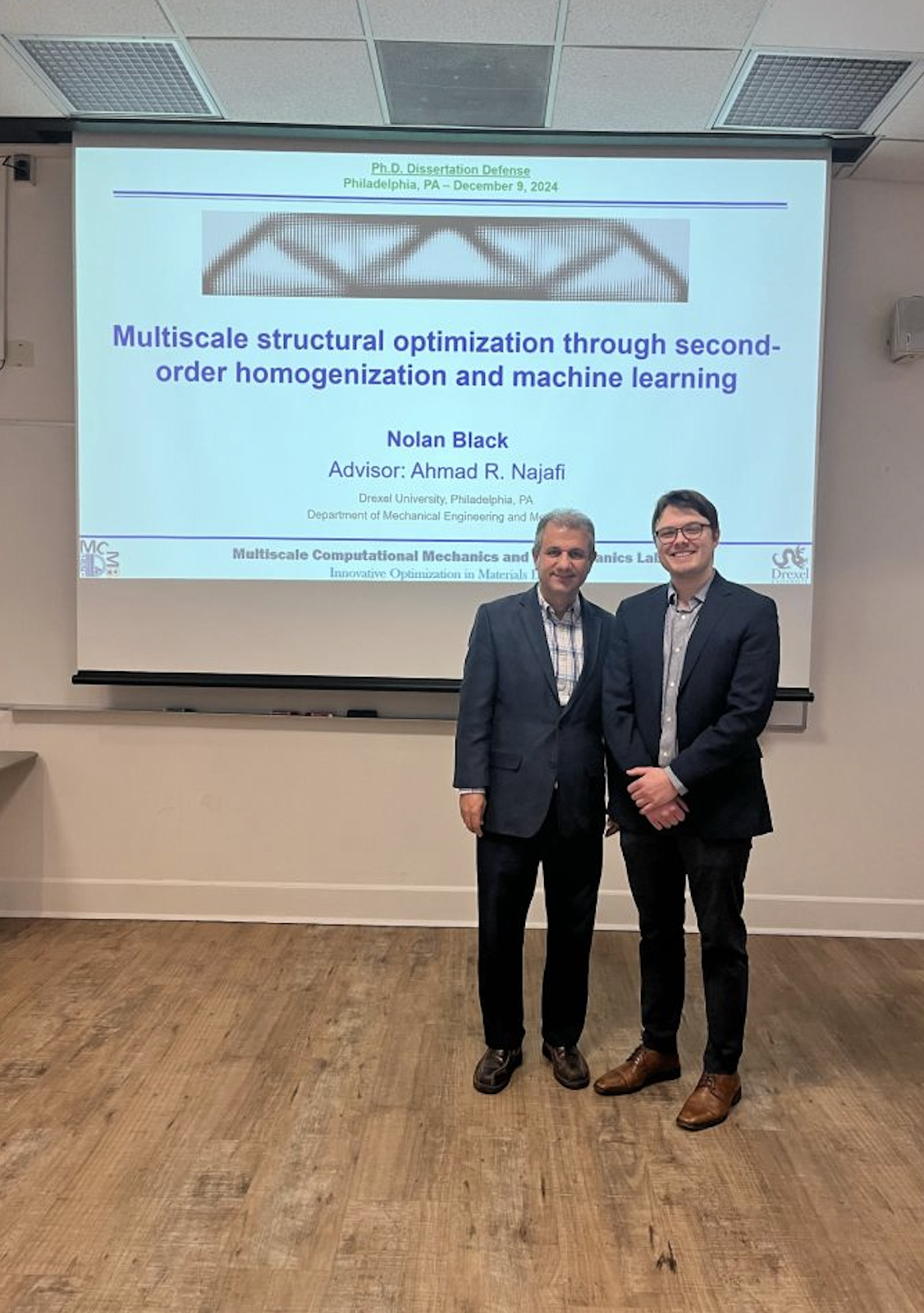 Congratulations to Nolan Black on his recent PhD defense and graduation! Nolan’s dissertation, titled “Multiscale Structural Optimization through Second-Order Homogenization and Machine Learning,” led to five first-author publications in prestigious journals such as Computer Methods in Applied Mechanics and Engineering and Structural and Multidisciplinary Optimization. Additionally, he contributed to five other articles, including one with his Master’s student mentee. Nolan’s new position will be as a Simulation Engineer at Pasteur Labs.
