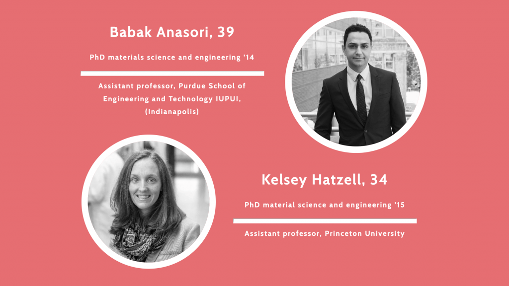 Two of our alumni, Kelsey Hatzell and Babak Anasori, were recognized among the Drexel 40 under 40 program this year. Both Kelsey Hatzell and Babak Anasori are each in an independent faculty position. They follow Maria Lukatskaya (2020), Pri Narang (2019), Kristy Jost (2018), and several earlier recipients of this recognition.
