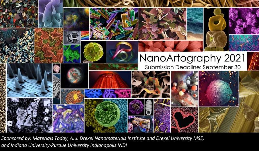 Submit your artistic research images by Sept. 30, 2021 to win $1000 and other cash prizes and to be featured on the NanoArtography website, calendar, and the Drexel Nanomaterials Institute calendar.