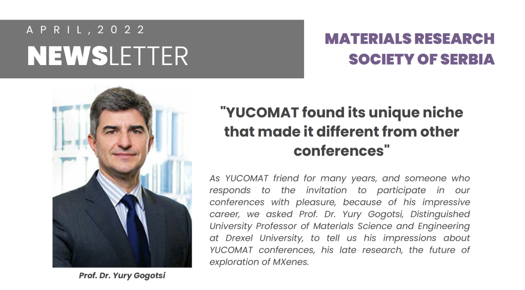 The April 2022 Materials Research Society of Serbia features an interview with Yury Gogotsi, Chair of the International Advisory Committee of YUCOMAT. Read the interview to learn more about Yury’s thoughts on the YUCOMAT 2022 conference, biomedical applications of MXenes, and his position regarding participation of Ukrainian and Russian scientists.