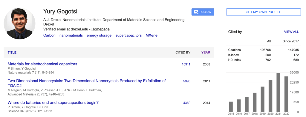 Professor Yury Gogotsi’s Google Scholar h-index has reached a symbolic milestone of 200! A huge congratulations to Prof Gogotsi who also thanks the numerous students, post-docs, visiting scientists and collaborators, who worked with him on solving important materials problems, discovery and characterization of new materials, and finding new applications for advanced materials.