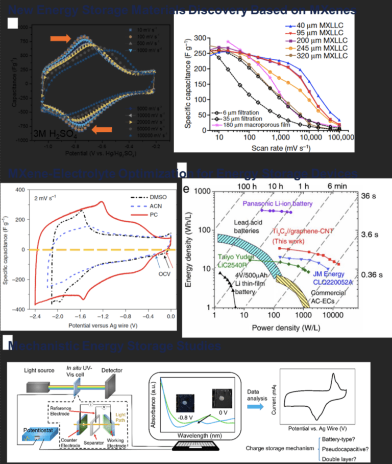 Since their discovery, MXenes have shown promising properties for energy storage. In our group, we use different MXene compositions as electrodes and other components in different electrochemical systems such as supercapacitors and batteries. This work aims to understand the electrochemical and charge storage behavior of MXenes in various electrolytes, including aqueous, water-in-salt, and organic electrolytes. Our goal is to gain a deep understanding of the pseudocapacitive and intercalation properties of MXenes in these systems and optimize and design electrode architectures for fast charge storage systems. In addition to electrochemical energy storage, our lab investigates the use of MXenes in hydrogen energy storage.