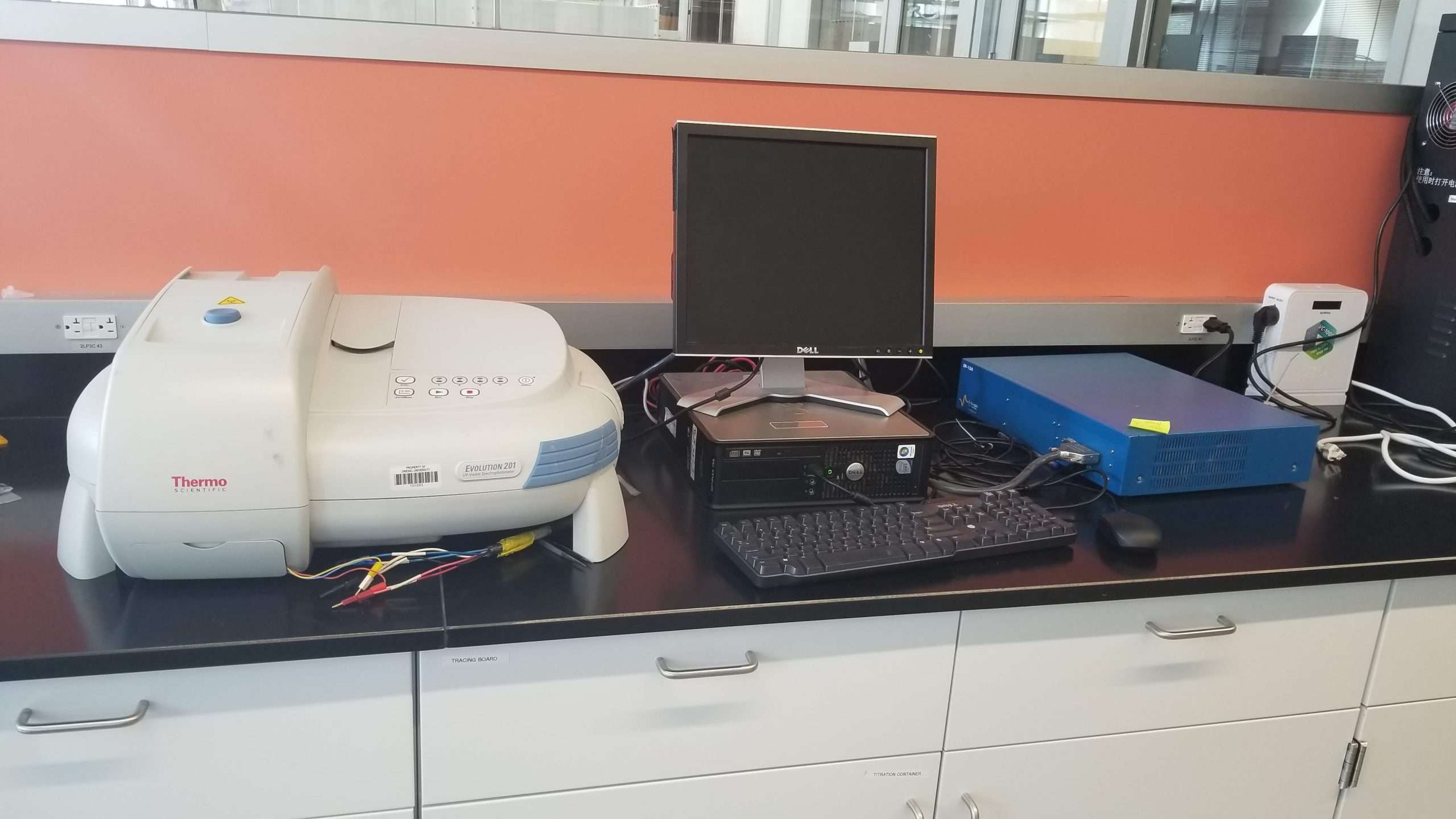 Purpose: UV-vis-NIR spectrophotometer (Evolution 201, ThermoScientific) from 190 nm to 1100 nm, optional to attach a potentiostat for in situ photo-electrochemistry experiments. Capability of absorbance and transmission measurements.