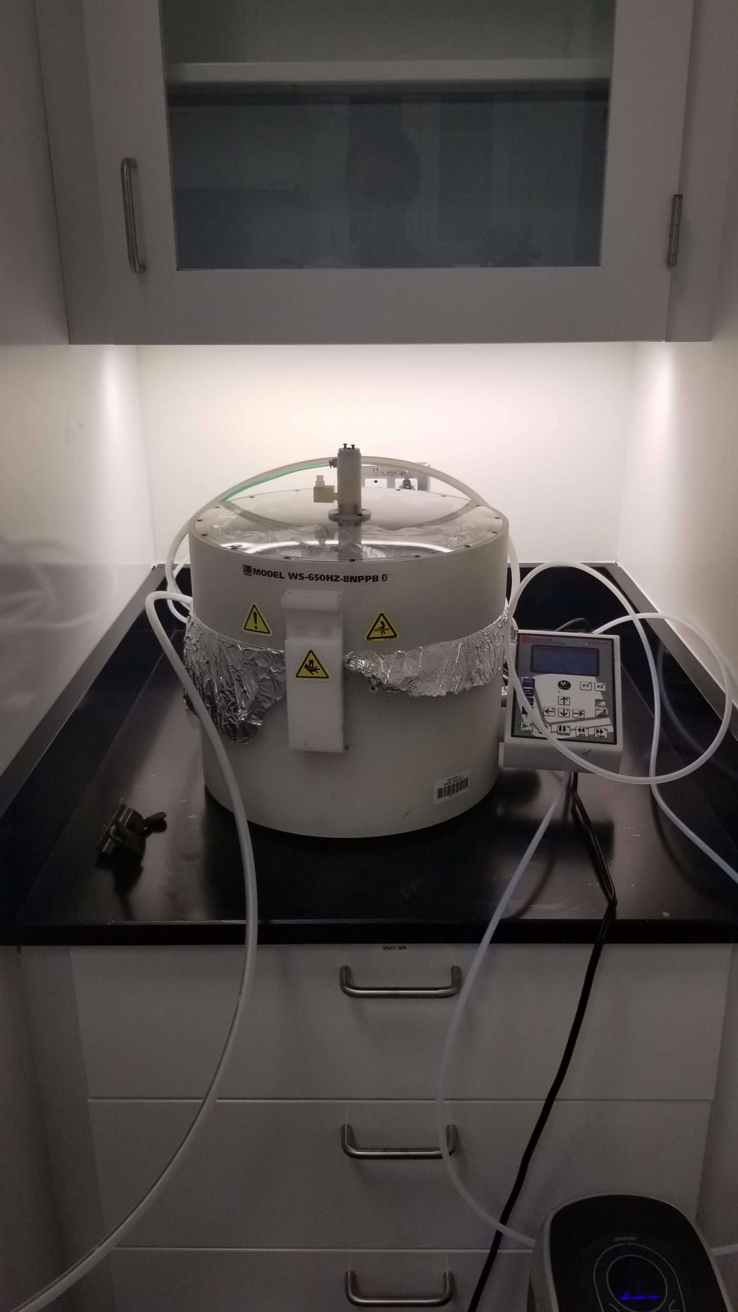 Purpose: Spin coater (Laurell Technologies Corporation, WS-650Hz-8NPPB) made of Teflon enabling solvent use. Accommodates 8 inch wafer. Max speed 12,000 rpm. It is used for thin film deposition.