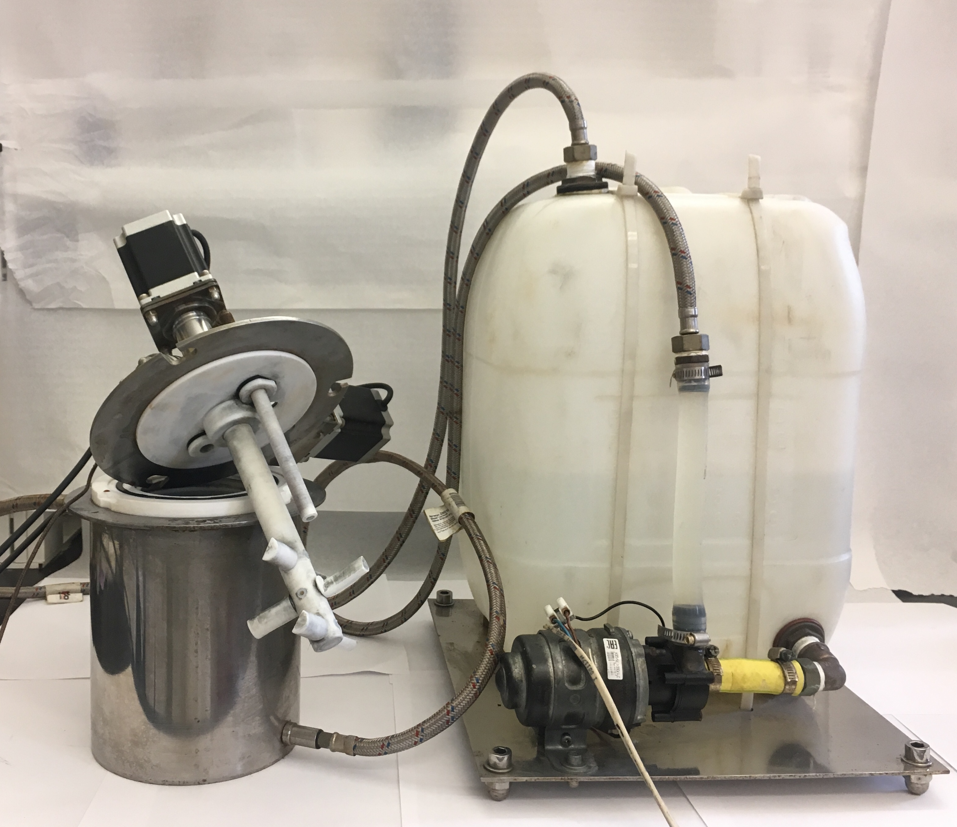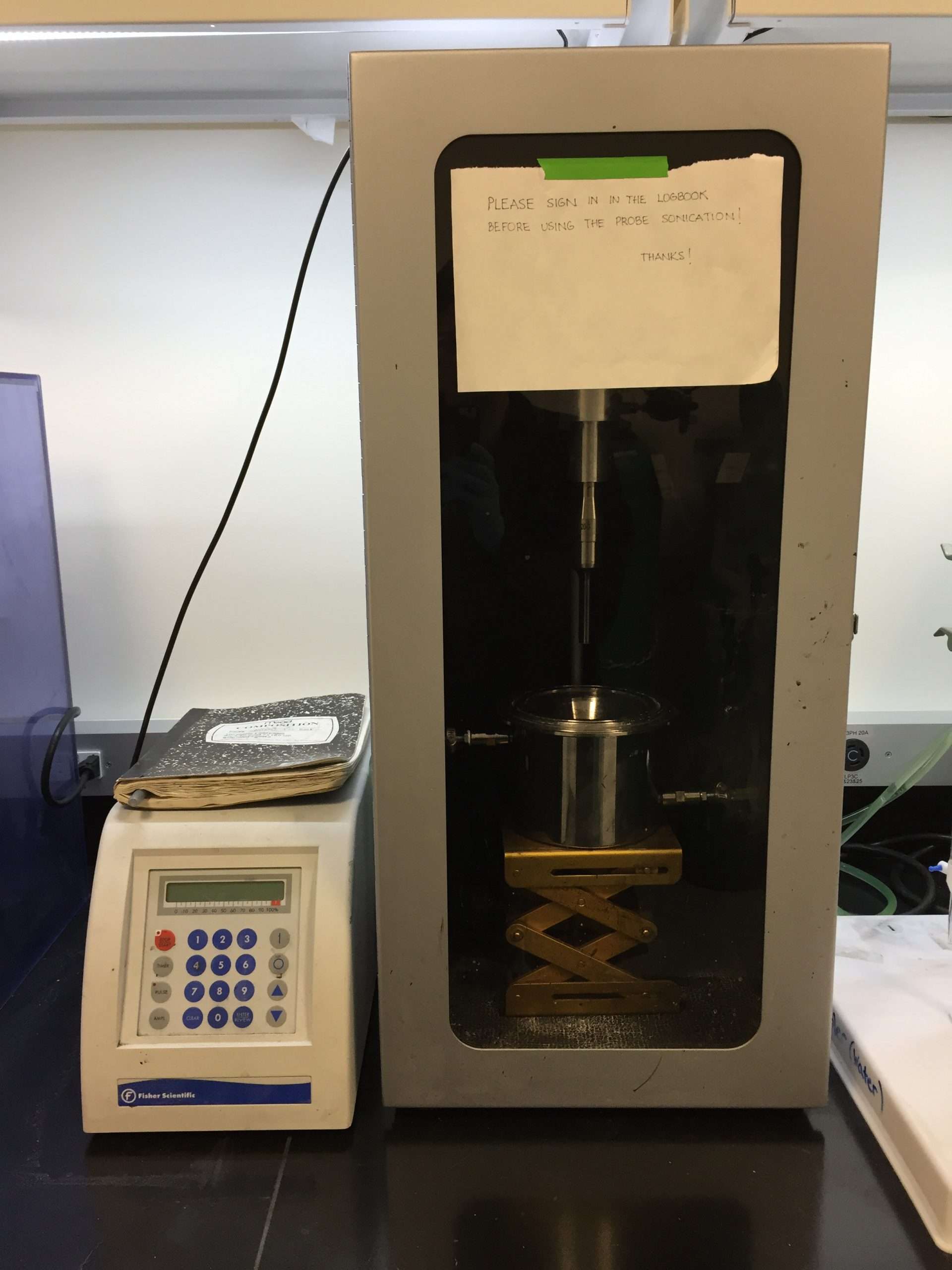 Purpose: Probe sonicator for exfoliation, dispersion, and self-assembly of materials. Coupled to recirculator with coolant to maintain low temperatures of dispersion.