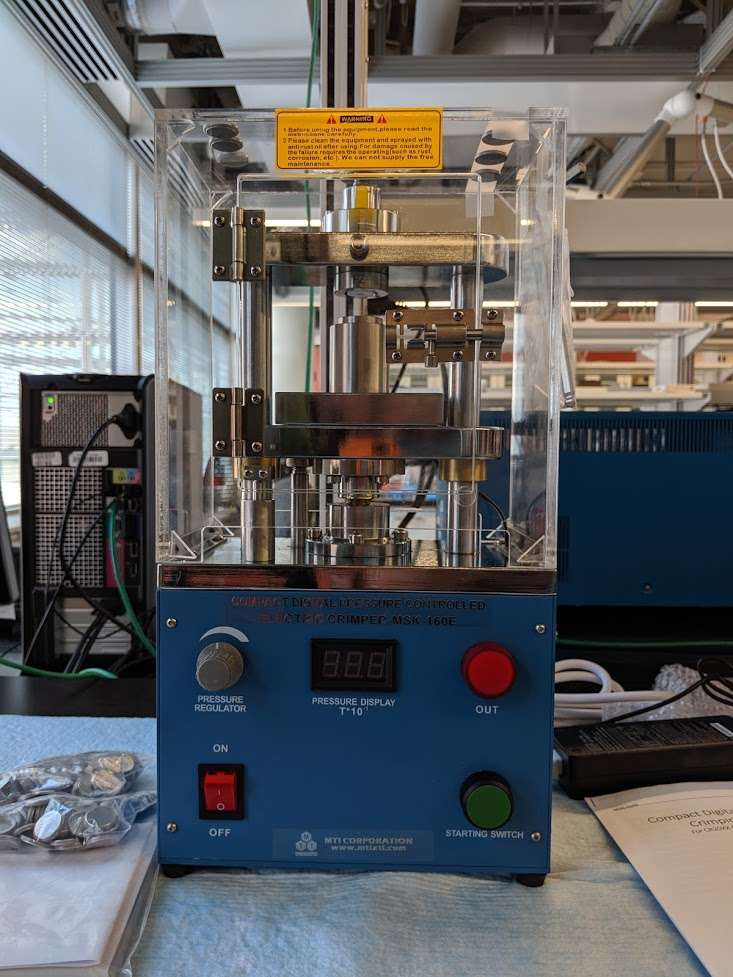 Purpose: Automated crimper for coin cells with digital pressure control. Manual unit inside the glovebox